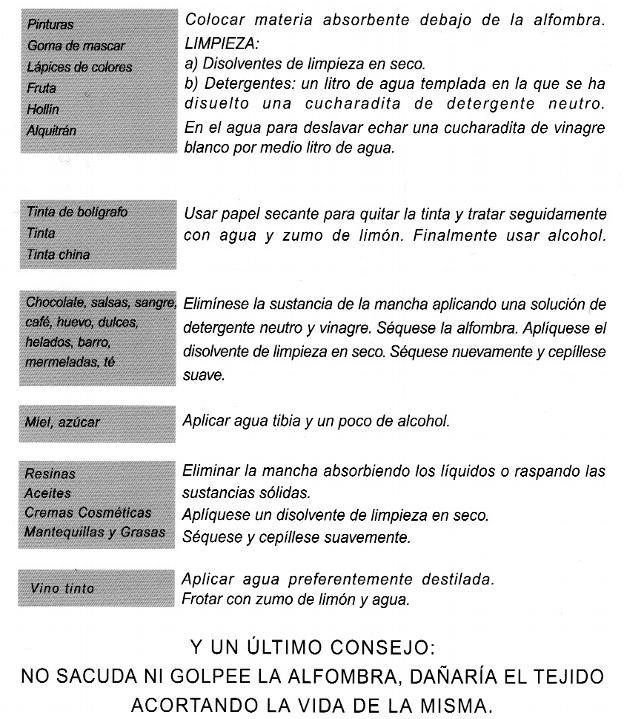 Se recomienda la limpieza a fondo, como mínimo, una vez al año. Puede utilizarse una tela de algodón de tal forma que sea cual fuese el líquido empleado como producto de limpieza, se transmita solo humedad a la alfombra, procurando no empaparla nunca. Se dejará secar durante varias horas. Es importante que la alfombra no sea pisada hasta que una vez seca, se cepille. Para la limpieza deberán emplearse detergentes neutros. Se aconsejan los de espuma seca.
